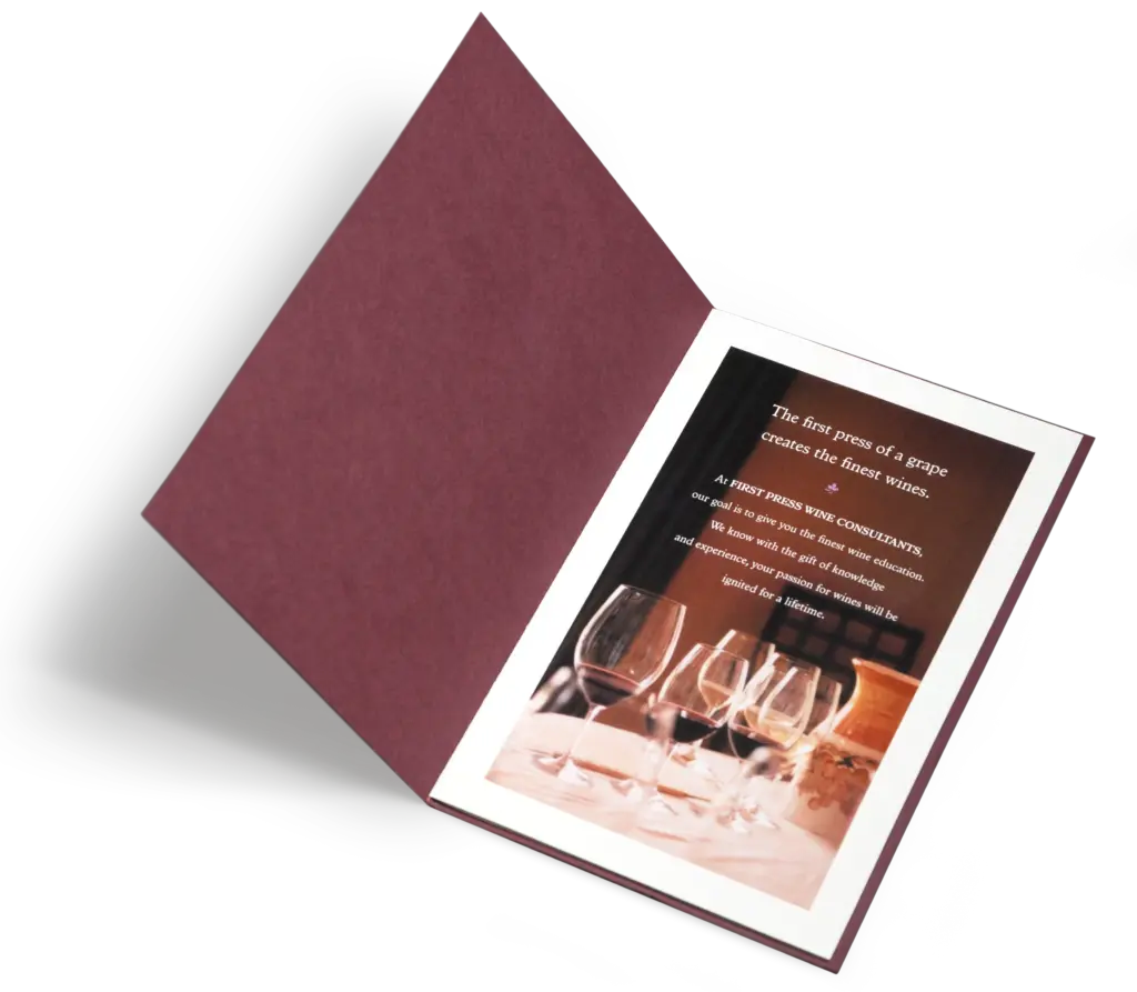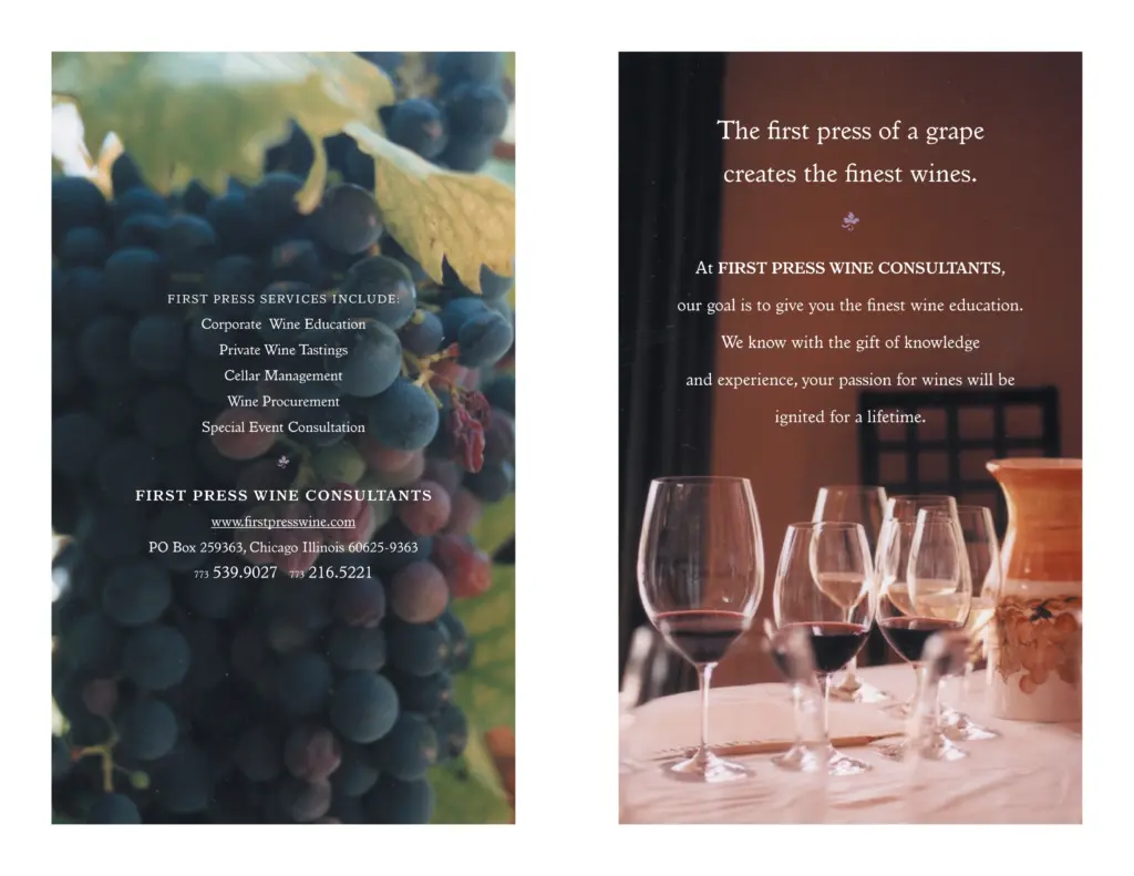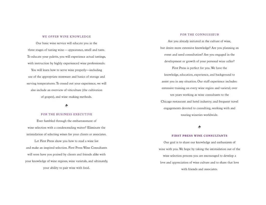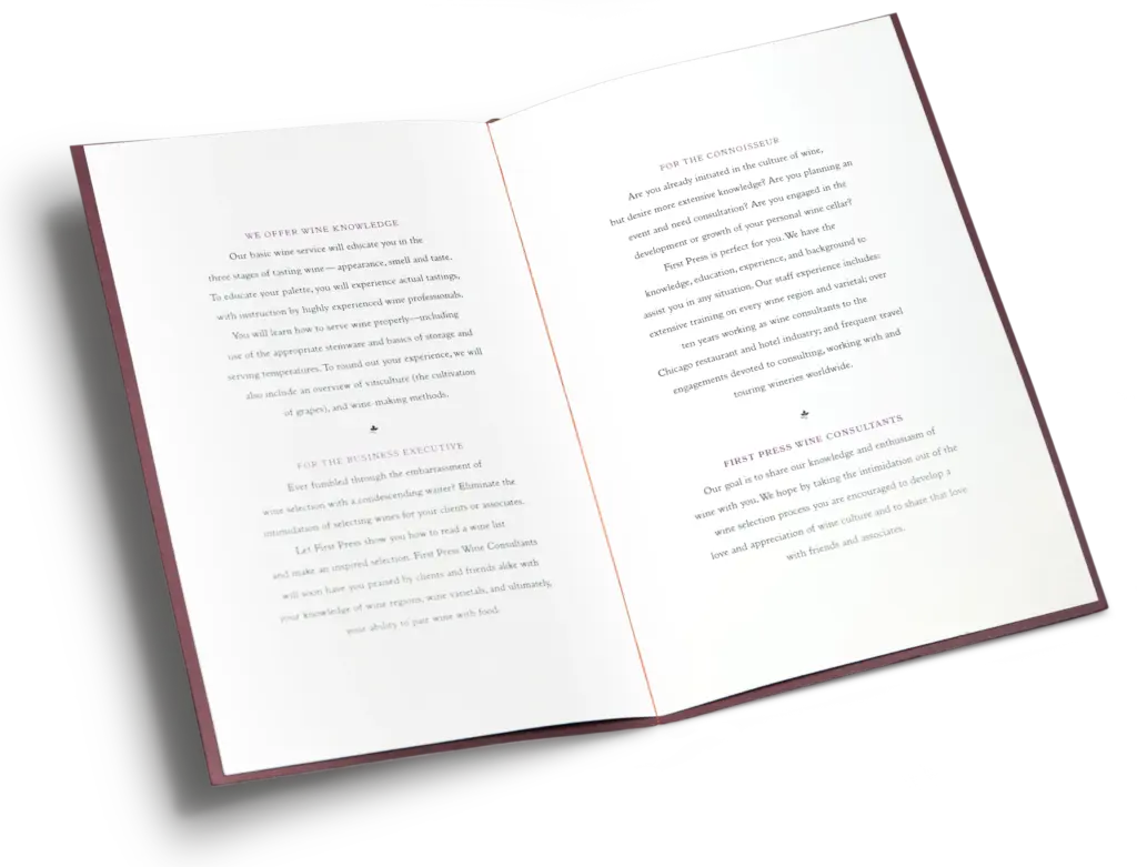 Created a promotional brochure and business card for a client’s wine consulting side-business. I incorporated images and edited basic text supplied by the client to create an elegant promotional brochure. The piece was elevated by the discovery of cache of embossed cover stock, and the client’s willingness to opt for engraved printing (for both the brochure cover and business card). I hand-assembled the covers and interior signatures and bound them together with hand-tied thread.